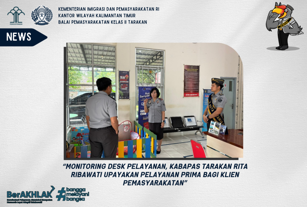 Bapas Tarakan Kembali Raih Predikat Unit Kerja Pelayanan Publik Berbasis Hak Asasi Manusia Tahun 2024 Tarakan- Berdasarkan keputusan Menteri Hak Asasi Manusia Kementerian Hak Asasi Manusia No: MHA.04.UM.04.01 Tahun 2024 pada 26 November 2024, Balai Pemasyarakatan Kelas II Tarakan kembali meraih predikat Unit Kerja Pelayanan Publik Berbasis Hak Asasi Manusia Tahun 2024. Sebelumnya, Bapas Kelas …