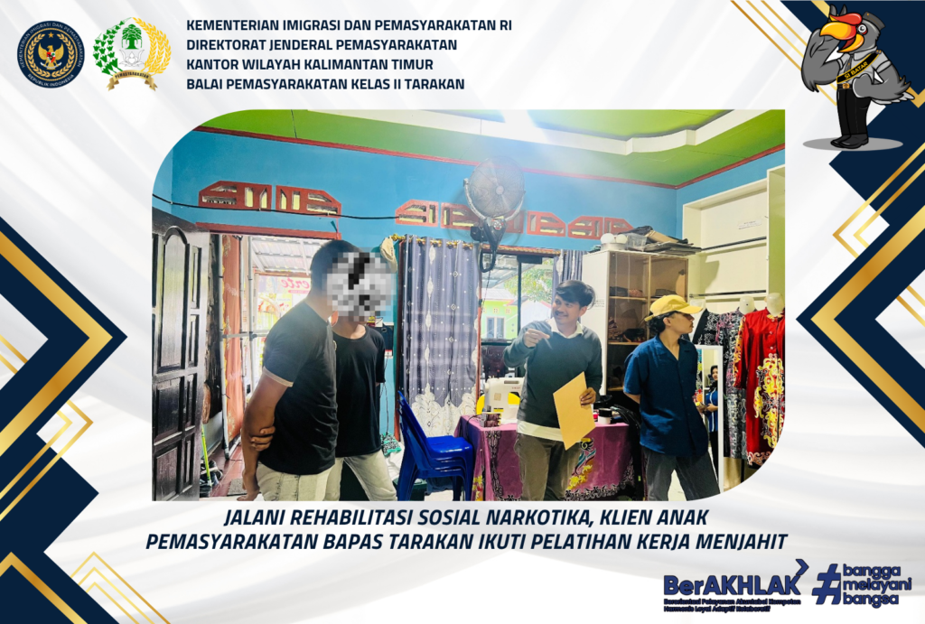 Jalani Rehabilitasi Sosial Narkotika, Klien Anak Pemasyarakatan Bapas Tarakan Ikuti Pelatihan Kerja Menjahit Tarakan-Menindaklanjuti kegiatan bimbingan kepribadian yang bekerja sama dengan Badan Narkotika Nasional Kota (BNNK) Tarakan pada Selasa, 24 Juni 2025 lalu, Klien Balai Pemasyarakatan (Bapas) Kelas II Tarakan hari ini menerima Rehabilitasi Narkotika BNNK Tarakan dalam Kegiatan Rujukan Pelatihan Kerja di Penjahit D’Erte …