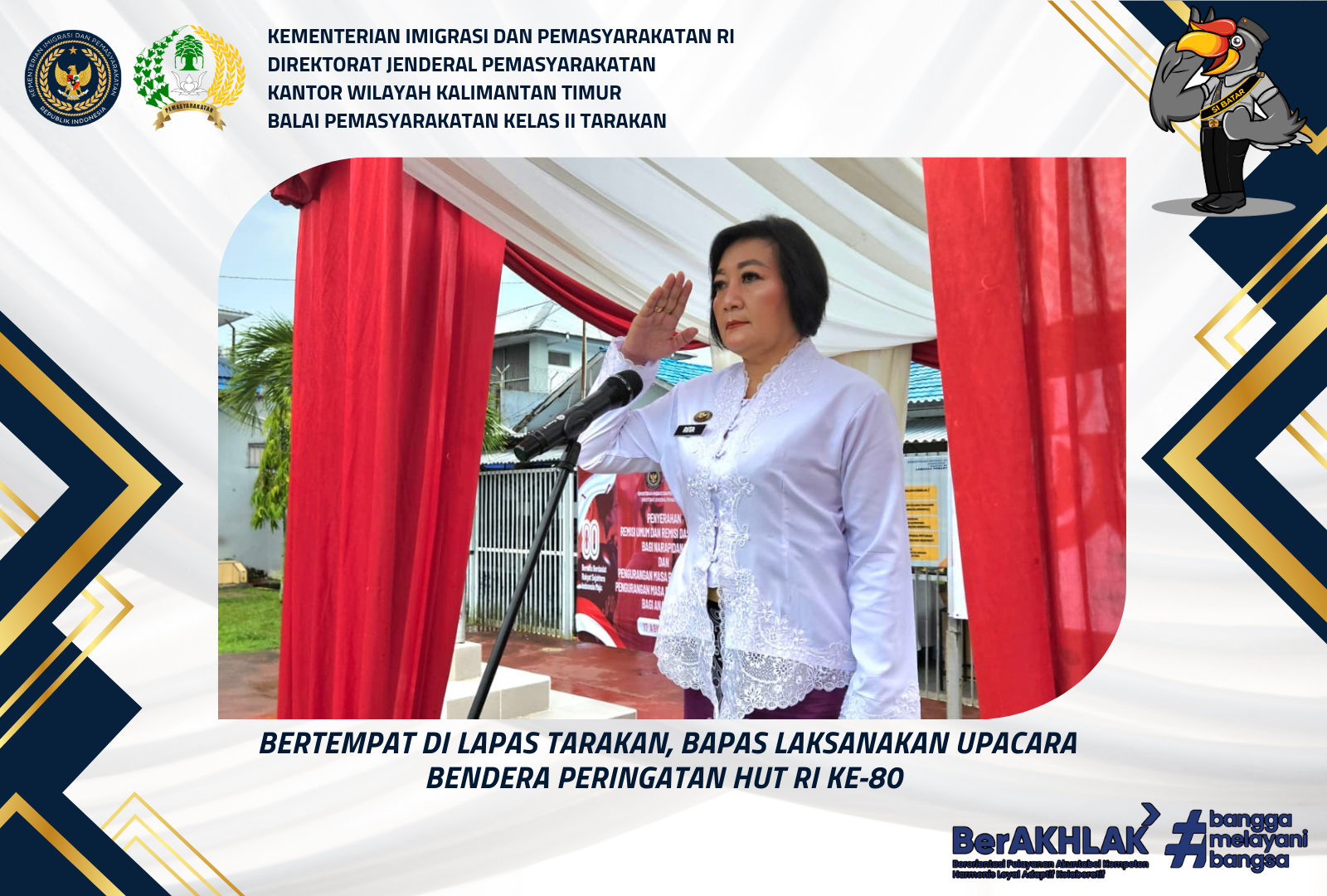 Tarakan-Bertempat di Lembaga Pemasyarakatan Kelas II A Tarakan, Balai Pemasyarakatan Kelas II Tarakan melaksanakan upacara bendera memperingati HUT RI ke-80 tahun 2025 pada Minggu, 17 Agustus 2025. Kepala Bapas Tarakan Rita Ribawati, memimpin langsung upacara bendera, disertai seluruh pegawai Bapas Tarakan, pegawai Lapas Tarakan, dan Warga Binaan Lapas Tarakan