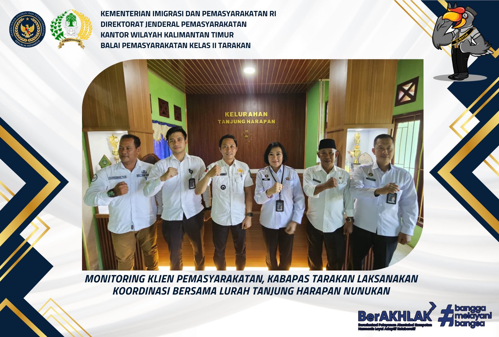 Nunukan-Kepala Balai Pemasyarakatan Kelas II Tarakan, Rita Ribawati, baru saja melaksanakan koordinasi bersama Lurah Tanjung Harapan Nunukan terkait pelaksanaan pengawasan Klien Pemasyarakatan oleh Pembimbing Kemasyarakatan, pada Rabu (10/09/2025). Adapun turut hadir dalam kegiatan Lurah Tanjung Harapan, Luqmansyah, dan Pembimbing Kemasyarakatan Madya, Muda, dan Pertama Bapas Tarakan.