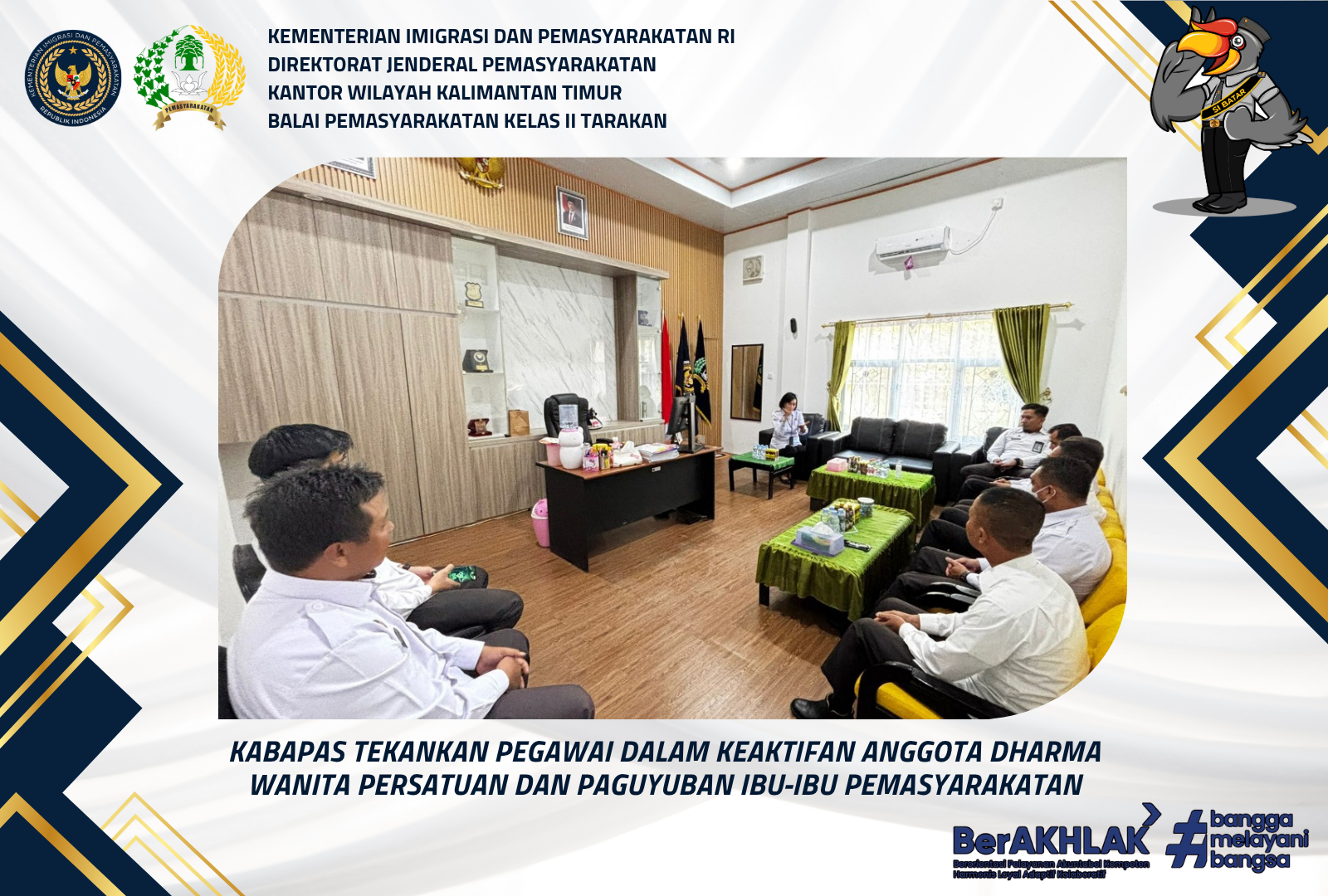 Tarakan-Kabapas Tarakan, Rita Ribawati, baru saja memberikan arahan kepada pegawai terkait partisipasi aktif Ibu-Ibu dalam Dharma Wanita Persatuan (DWP) dan Paguyuban Ibu-Ibu Pemasyarakatan (PIPAS) pada Senin (20/10/2025). Adapun kegiatan diikuti oleh seluruh pegawai Struktural, JFT, dan JFU Bapas Tarakan.