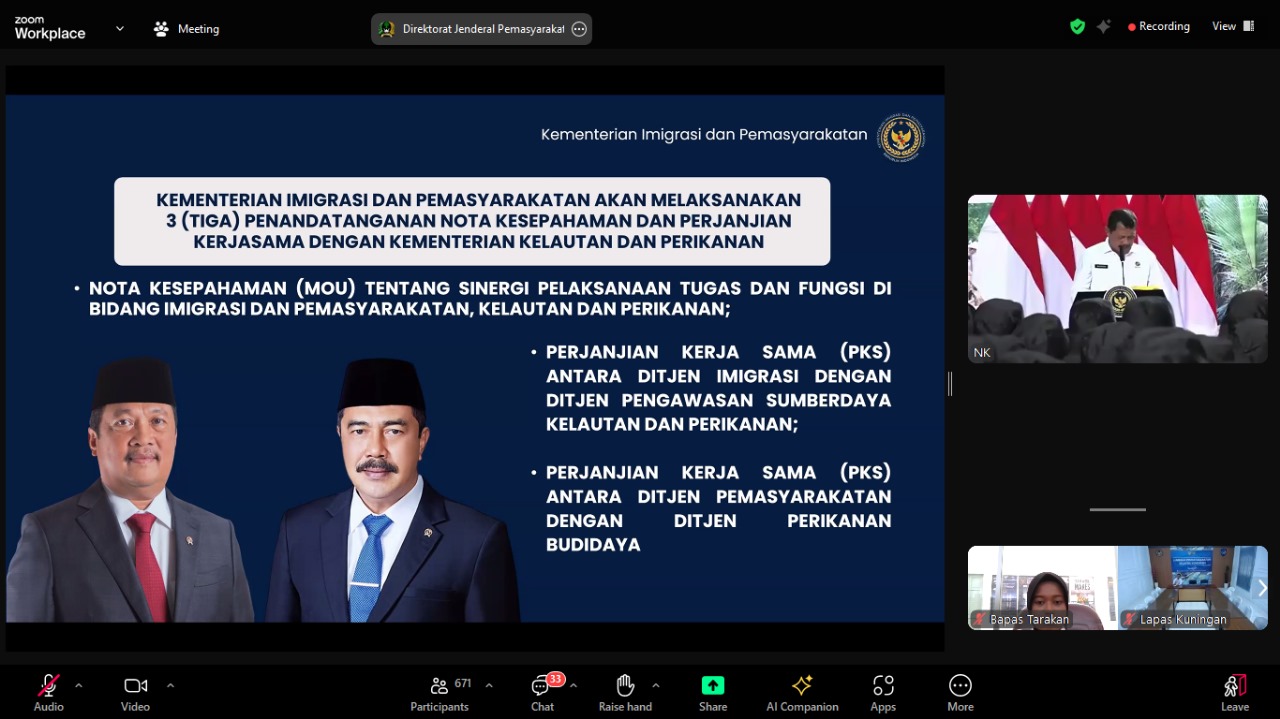 Tarakan-Balai Pemasyarakatan Kelas II Tarakan, yang diwakili oleh Pembimbing Kemasyarakatan Pertama Cahyani Wulan baru saja mengikuti Zoom Penandatanganan Nota Kesepahaman antara Kemenimipas dengan Kementerian Kelautan dan Perikanan pada Rabu (05/11/2025). Kegiatan dihadiri langsung oleh Menteri Imigrasi dan Pemasyarakatan, Agus Andrianto, eselon 1, stafsus, jajaran, Dirjenpas Mashudi, dan Kementerian Kelautan dan Perikanan.