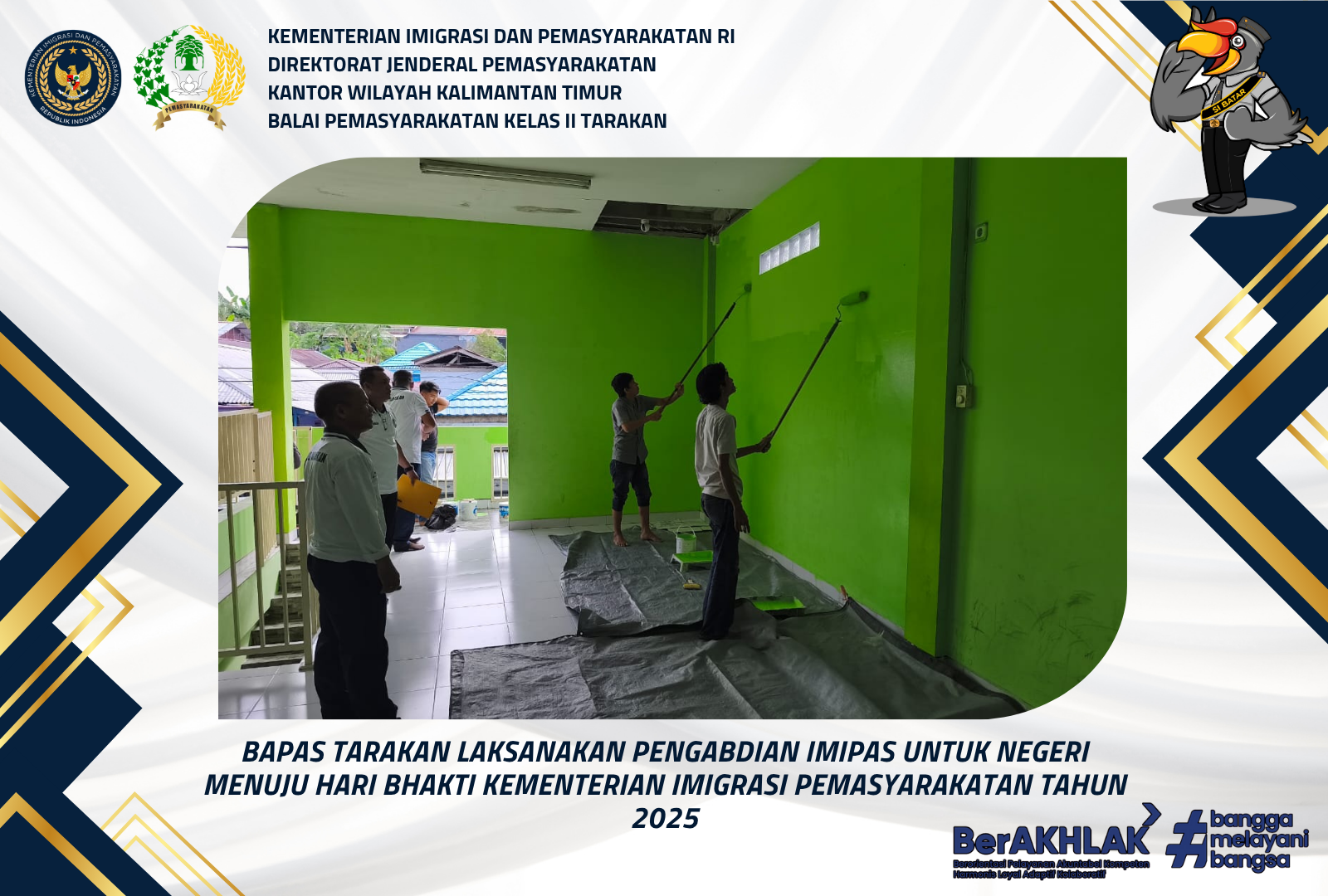 Tarakan-Menindaklanjuti Keputusan Menteri Imigrasi dan Pemasyarakatan Nomor: MIP.HK-03.02.78 tentang Penetapan Hari Lahir Kementerian Imigrasi dan Pemasyarakatan, Balai Pemasyarakatan Kelas II Tarakan baru saja melaksanakan melaksanakan program “Pengabdian IMIPAS Untuk Negeri” yang berfokus pada kegiatan perbaikan sarana dan prasarana umum, pada Jumat (14/11/2025).