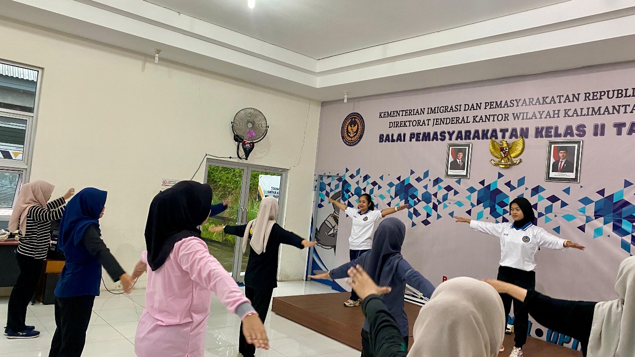 Tarakan – Dalam rangka menjaga stamina dan produktivitas kerja, selaku instruktur dan Pembimbing Kemasyarakatan Ahli Pertama, Ningrum, memimpin peserta magang Kementerian Ketenagakerjaan latihan Fisik Mental Disiplin (FMD) dengan olahraga kardio, pada Jumat (12/12/2025). Kegiatan ini dilaksanakan di Aula Bapas Tarakan, FMD merupakan kegiatan rutin yang diadakan oleh Bapas Tarakan setiap hari Jumat pagi.
