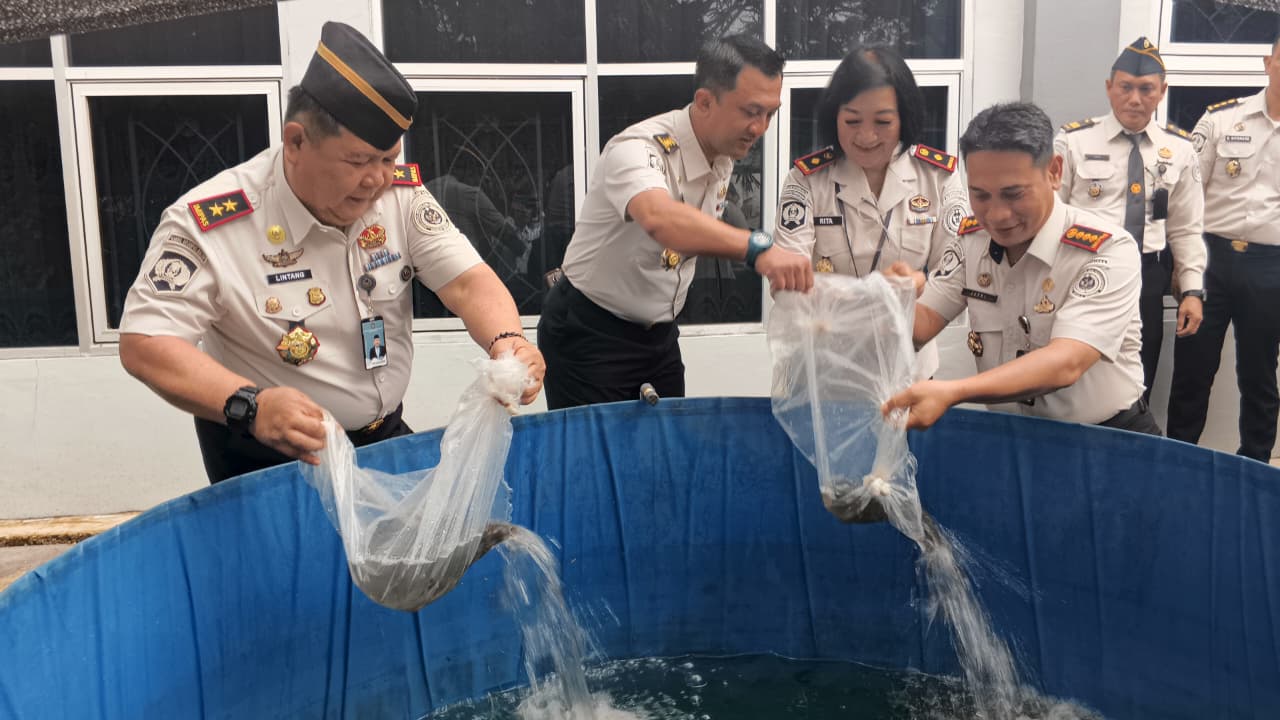 Bersama Kakanwil Ditjen Pas Kaltim, Bapas Tarakan Laksanakan Tebar Benih Lele di Griya Abhipraya Paguntaka